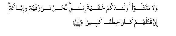 [31] 7. Do not kill your offspring for fear of want: for it is We Who provide them and you as well. Indeed their killing is a heinous crime.31