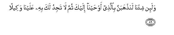 104Though these words arc apparently addressed by the Holy Prophet, they are in fact meant for the disbelievers who considered the Holy Qur'an to be either the invention of the Holy Prophet himself or of some other man, who secretly taught him the Qur'an. They are being told that this is the Word of Allah, as if to say, "Our Prophet has not fabricated the Qur'an but We have bestowed this on him, and if We take it back from him, the Prophet has no power to invent such a thing nor has any other man the power to help the Prophet to present such a miraculous Book."