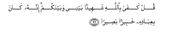 [96] O Muhammad, say to them, "Allah suffices for a witness to judge between you and me: for He is fully aware of and is observing what His servants are doing."109