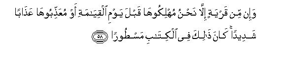[58] There is no habitation which We shall not destroy before the Day of Resurrection or punish with a severe chastisement.66 This has been ordained in the Eternal Record.