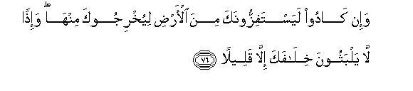 [76] And these people have persistently been trying to uproot you from this land and exile you from it, but if they do so, they will not be able to stay here much longer.89