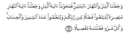 [12] Behold! We have created day and night as two signs: We have deprived the sign of night of light and made the sign of day bright to enable you to seek bounty of your Lord and to reckon months and years. Thus We have made everything manifestly distinct.13